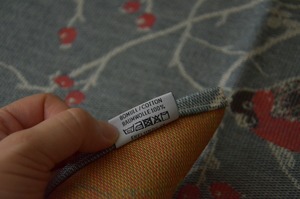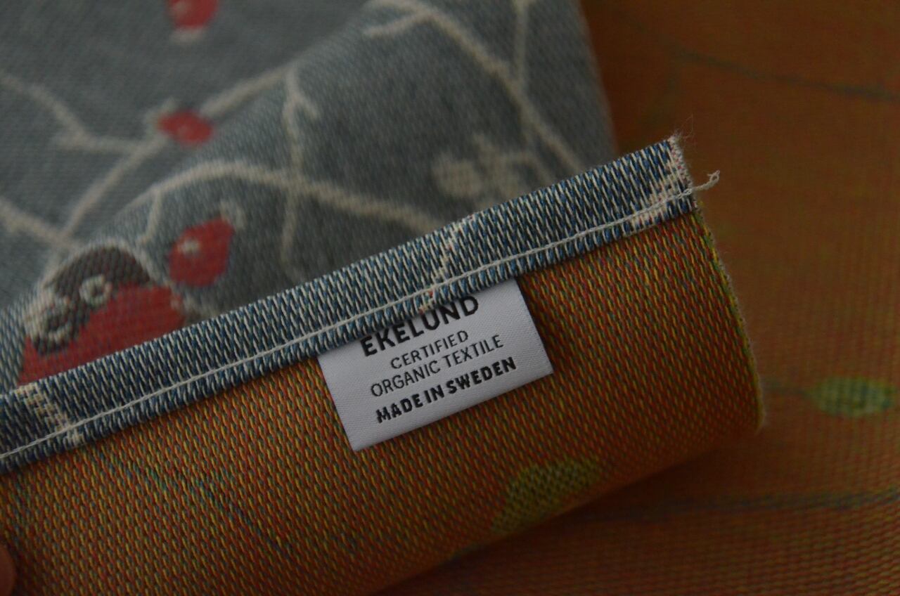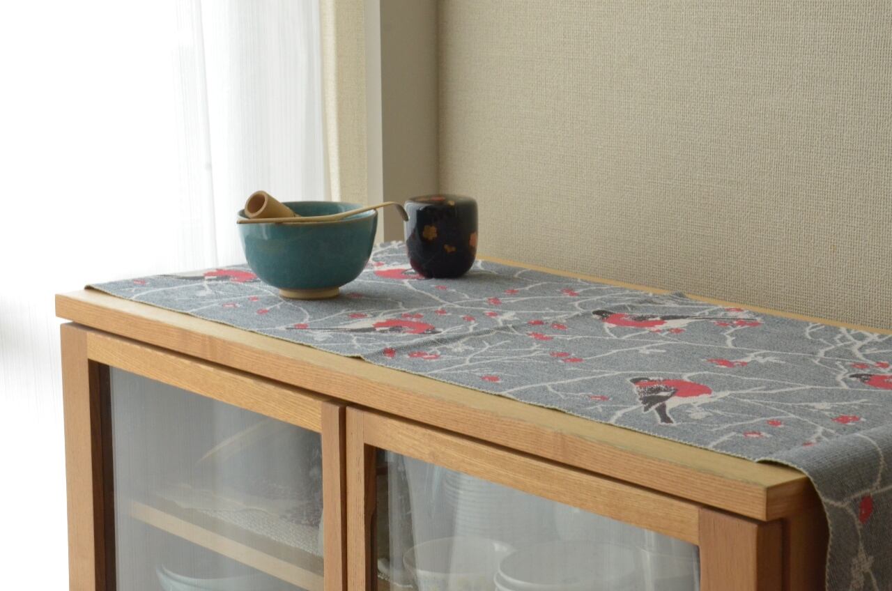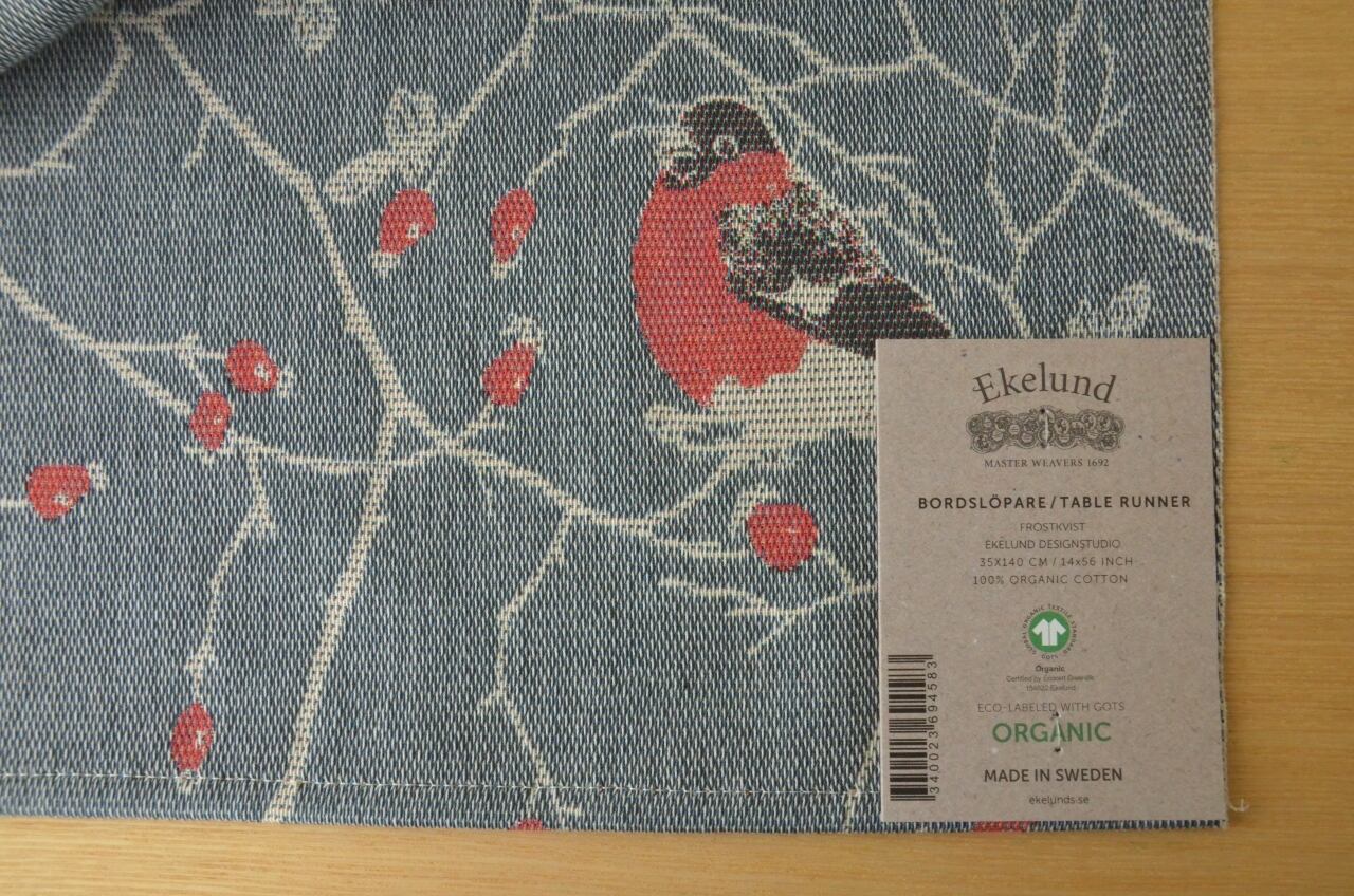1692年創業の、スウェーデンのテキスタイルブランド、、Ekelund(エーケルンド)社製のテーブルランナー・35cm×140cm。ブルーグレーの地に、小枝に留まる小鳥が描かれています。
