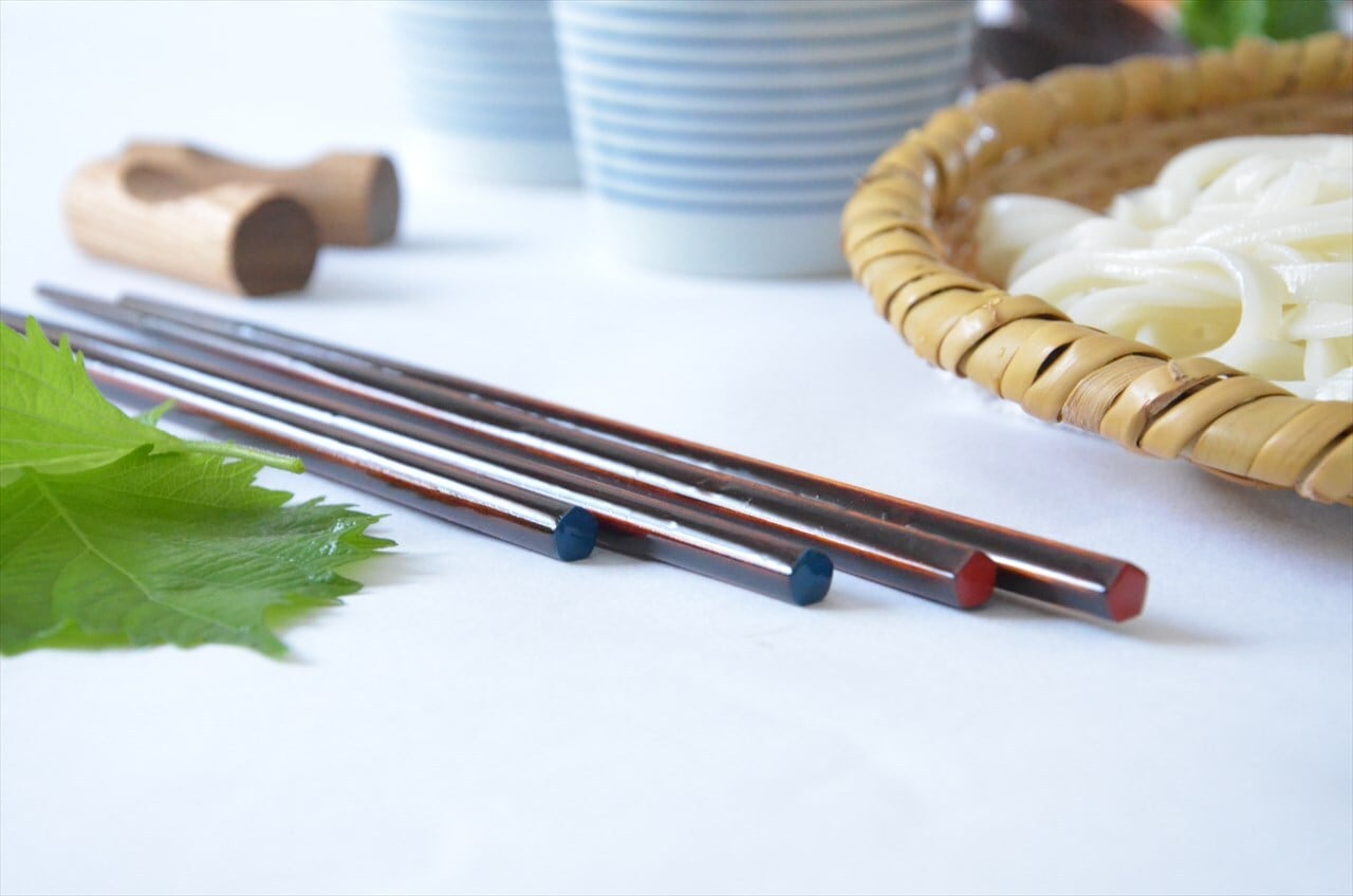 箸先は、漆を重ねて強度を増した《つや仕上げ》。色とサイズは、23cmがblueとgreen、22cmがyellowとredの各2色です。お好みの組み合わせをお選びください。