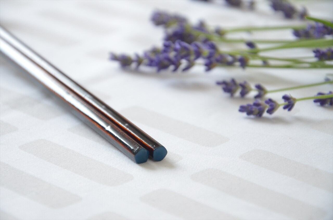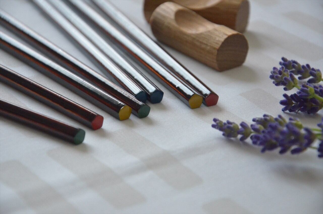 信州木曽の漆工房で、職人が一本一本手づくりで仕上げる漆の塗り箸。軽くて丈夫、ポップなアクセントカラーが魅力の【五角春慶】の塗り箸。贈りもの用化粧箱入りのペアセットをご用意しました。