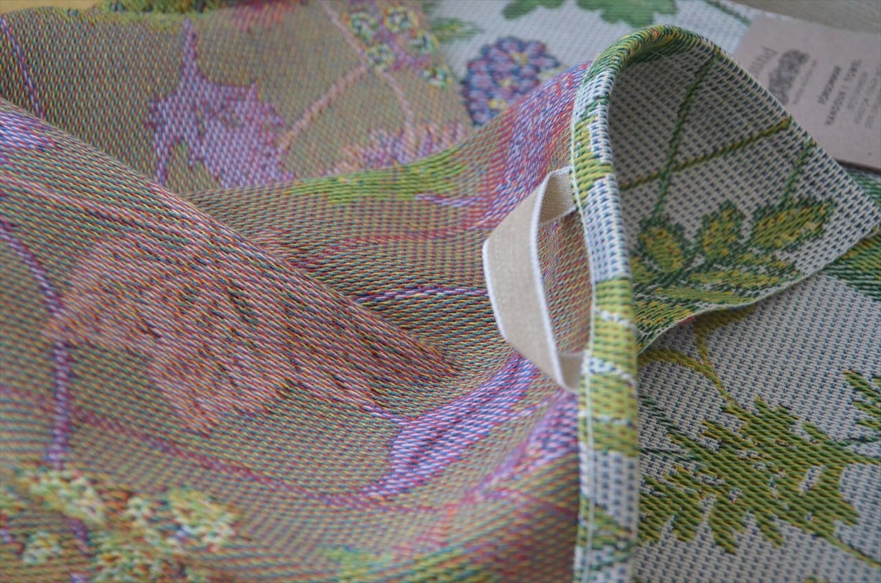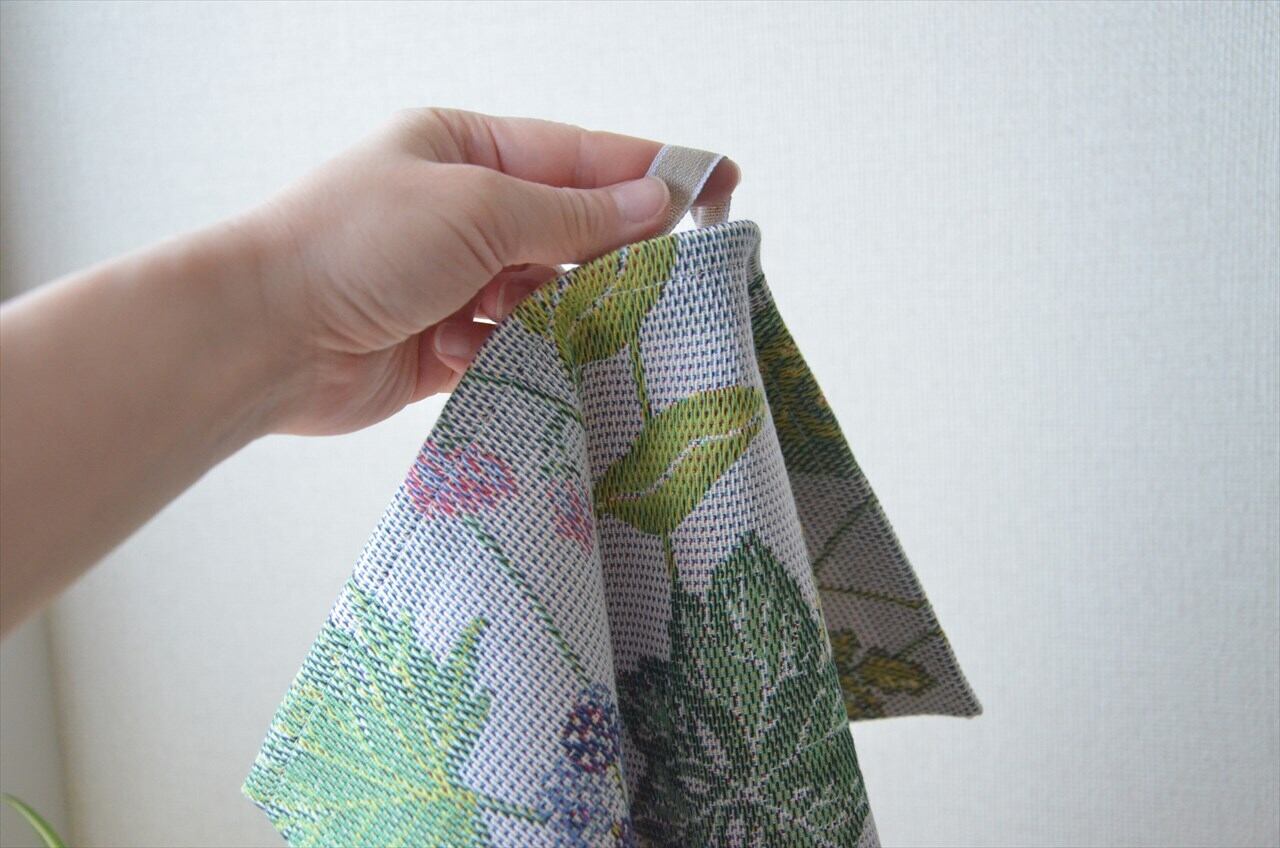 織り糸が何層にも重なっているので厚みがあり、重厚感・上質感たっぷり。それでいて吸水性にもすぐれ、普通にお洗濯できるのが魅力です。裏側にフープのついた、タオルタイプ。キッチンタオルとしてはもちろん、テーブルセンターにも。大判なので、レンジやプリンターを覆うカバーとしても活躍します。