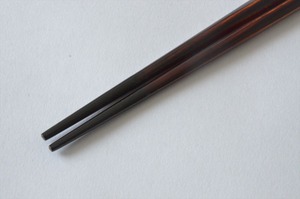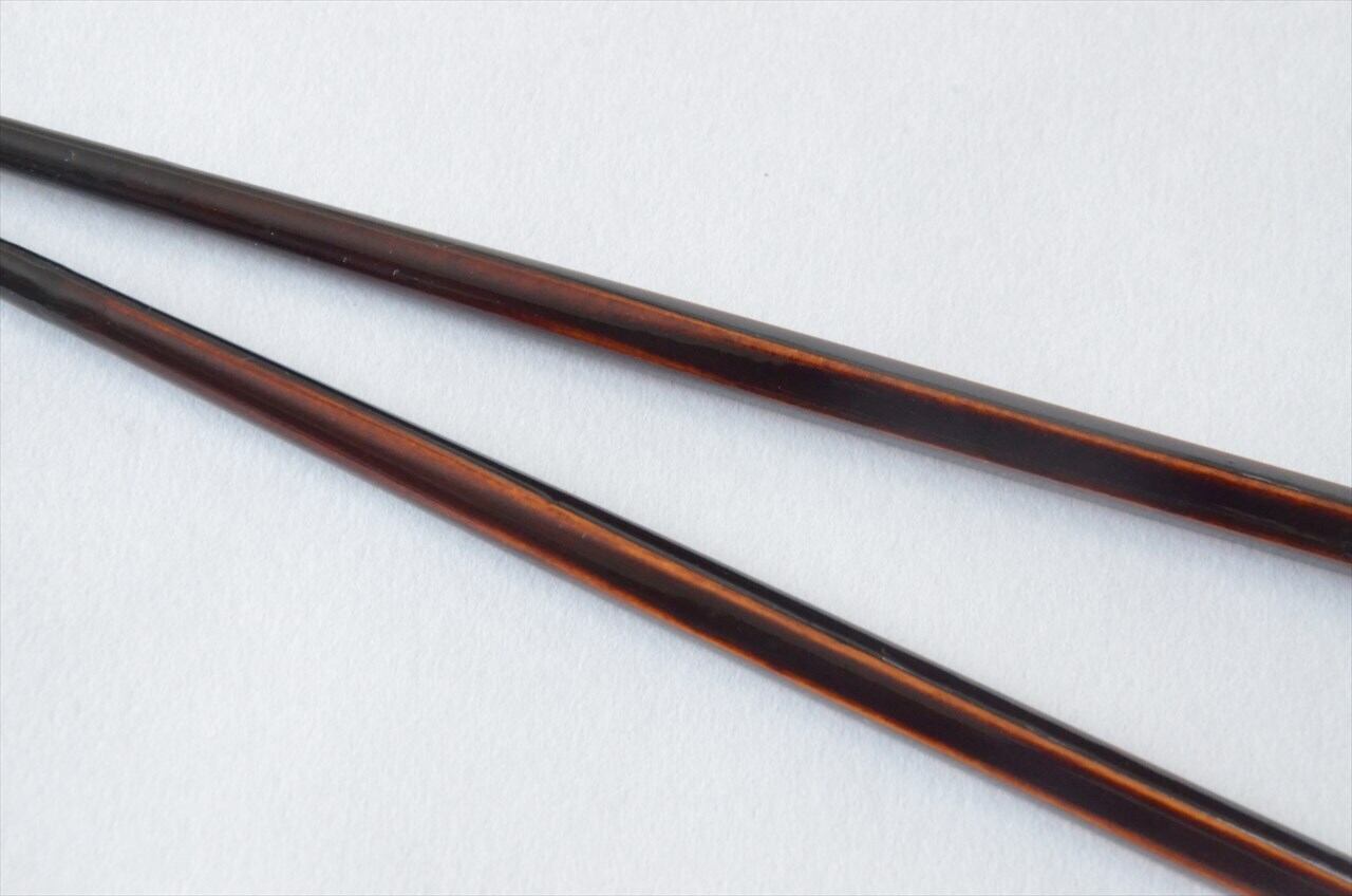 信州木曽の漆工房で、職人が一本一本手づくりで仕上げる漆の塗り箸。木目が透けて見える 木曽漆器の代表的な仕上げのひとつ「春慶塗り」で、箸先は漆を塗り重ねて強度を増しています。