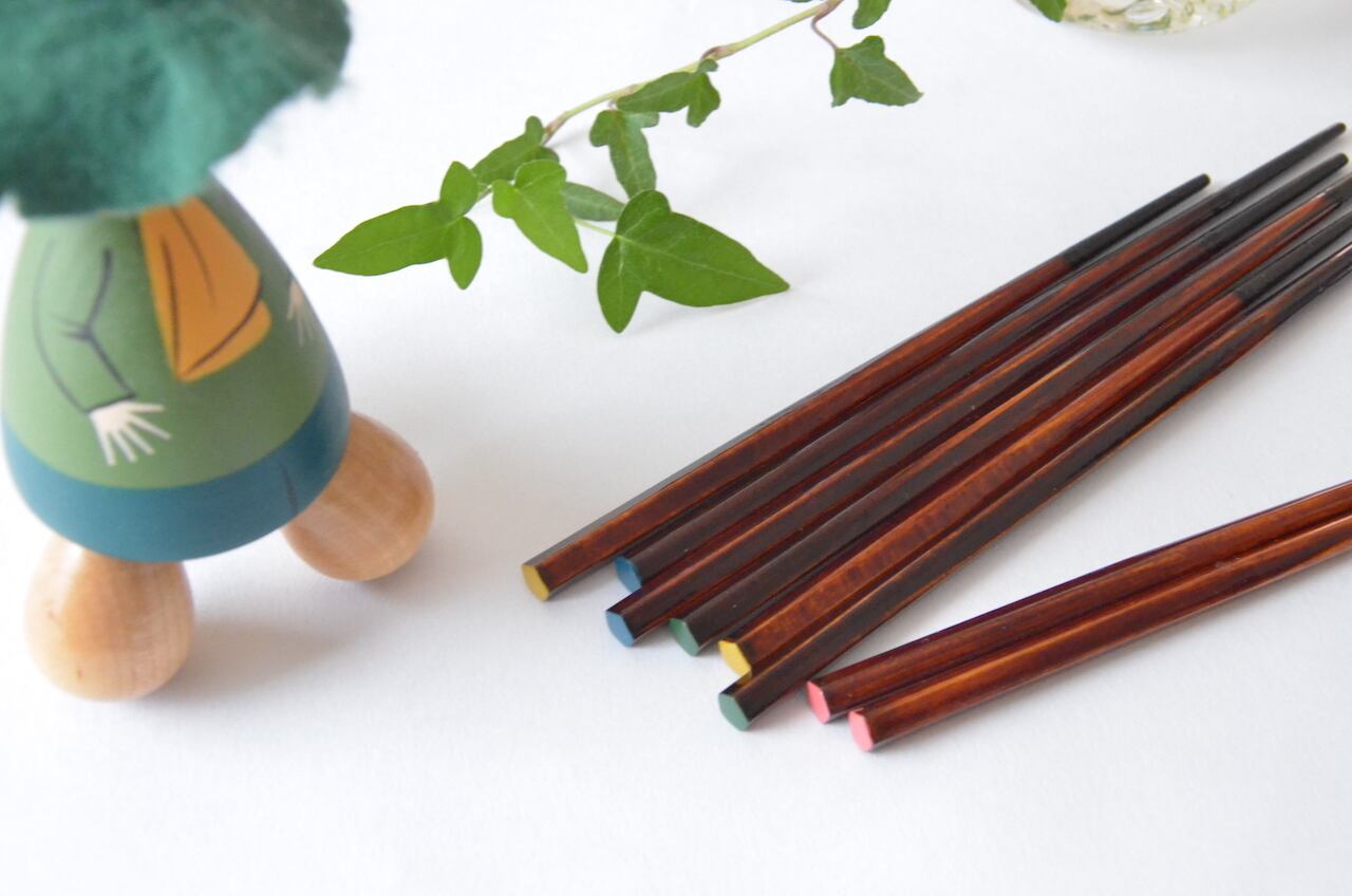 信州木曽の漆工房で、職人が一本一本手づくりで仕上げる漆の塗り箸。軽くて丈夫、ポップなアクセントカラーが魅力の【五角春慶】塗り箸に、お子さま用サイズをご用意しました。