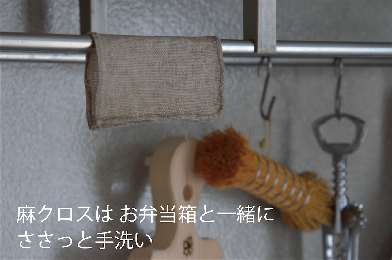 ・麻クロス(おおむね10cm四方)をおまけでお付けしています。こちらは毎日気軽にお洗濯いただけます。お弁当箱と一緒にキッチンでささっと手洗いするのがオススメです。麻なので乾きが早くお手入れ簡単です。