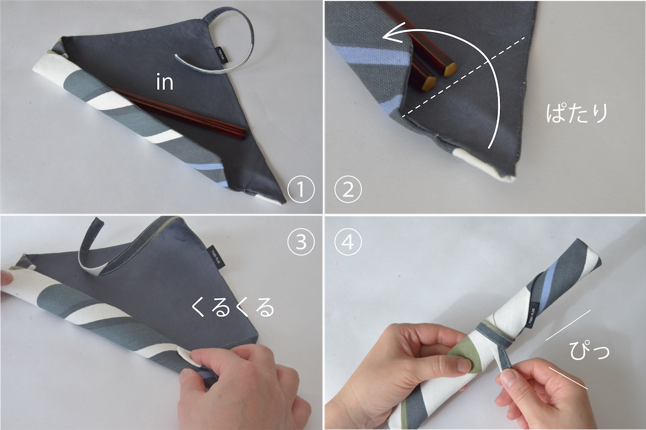 使い方は、塗り箸をポケットに収めてくるくる巻くだけ。お食事後、箸先の汚れが気になるときは、付属の麻クロスで箸先を包んでおしまいください。(麻クロスはおまけでひとつお付けしています)