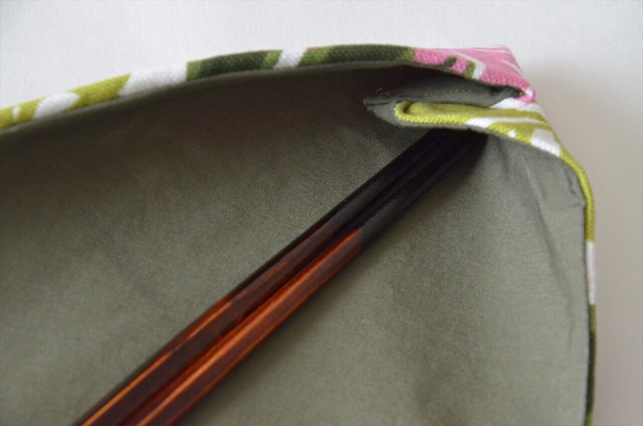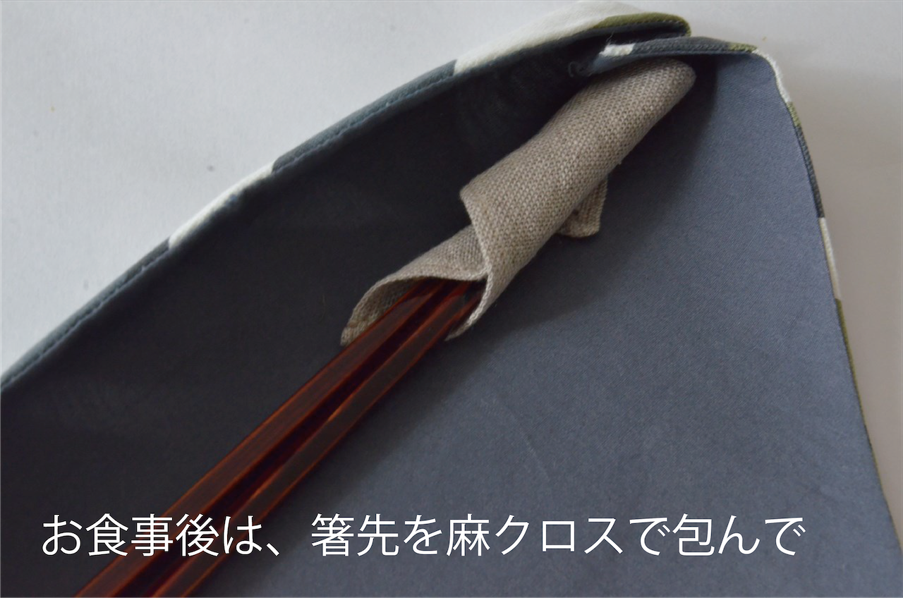 使い方は、塗り箸をポケットに収めてくるくる巻くだけ。お食事後、箸先の汚れが気になるときは、付属の麻クロスで箸先を包んでおしまいください。(麻クロスはおまけでひとつお付けしています)