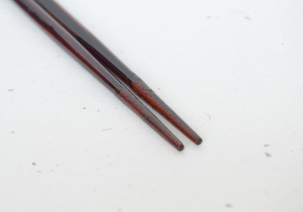 信州木曽の漆工房で、職人が一本一本手づくりで仕上げる漆の塗り箸。木目が透けて見える 木曽漆器の代表的な仕上げのひとつ「春慶塗り」で、箸先は漆を塗り重ねて強度を増しています。